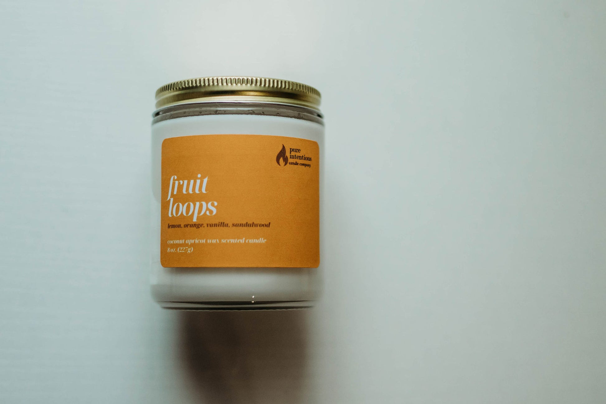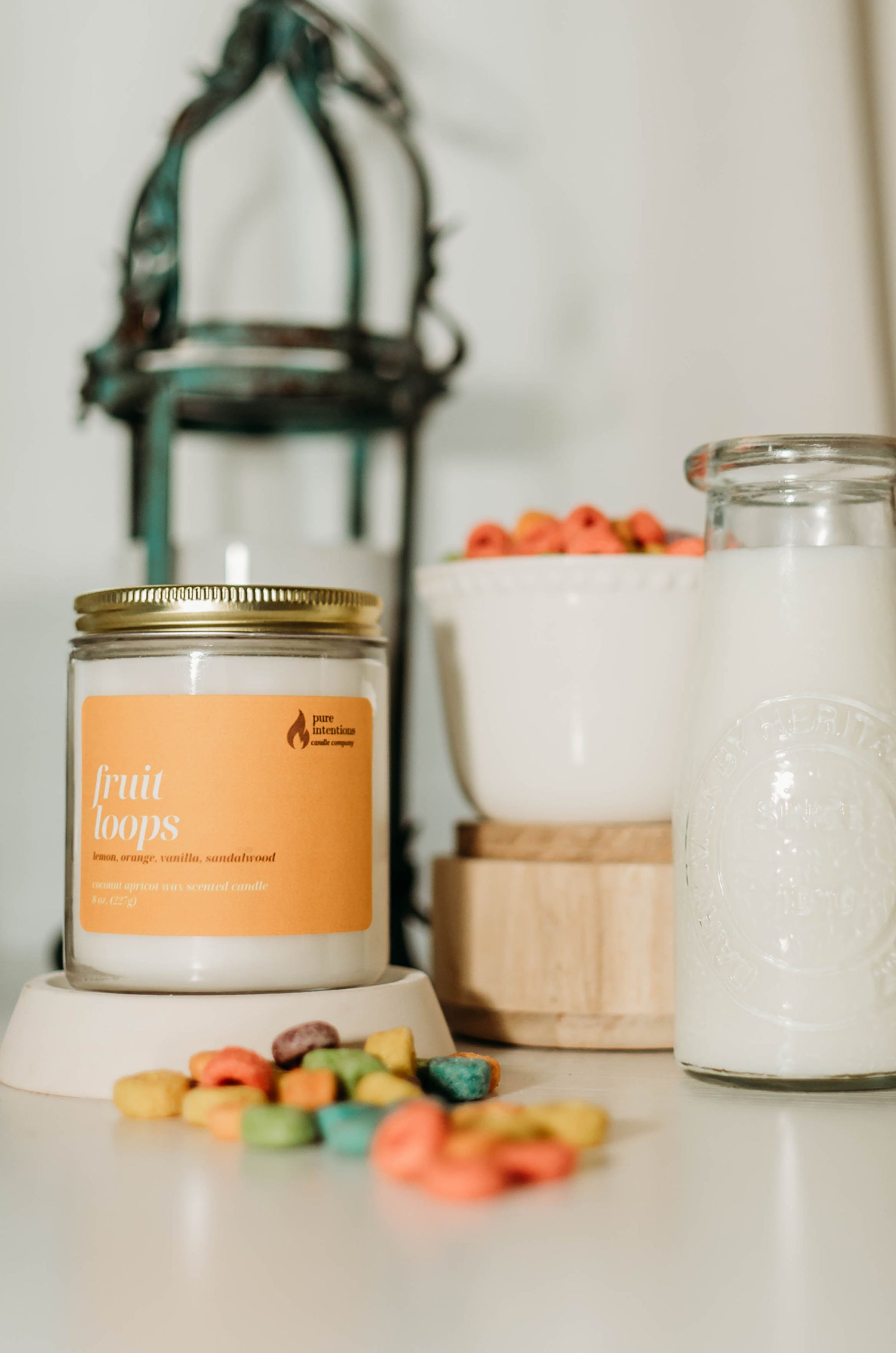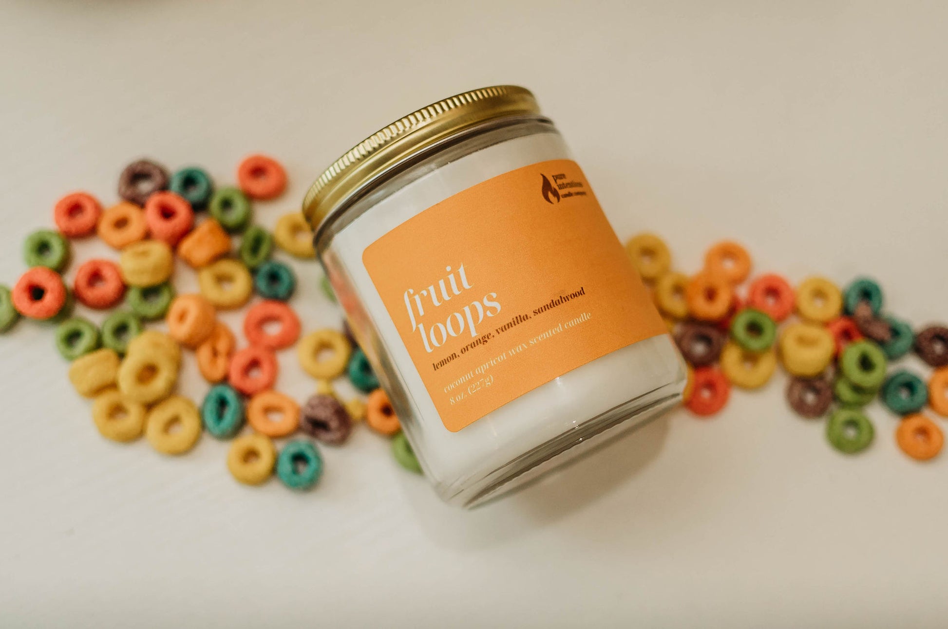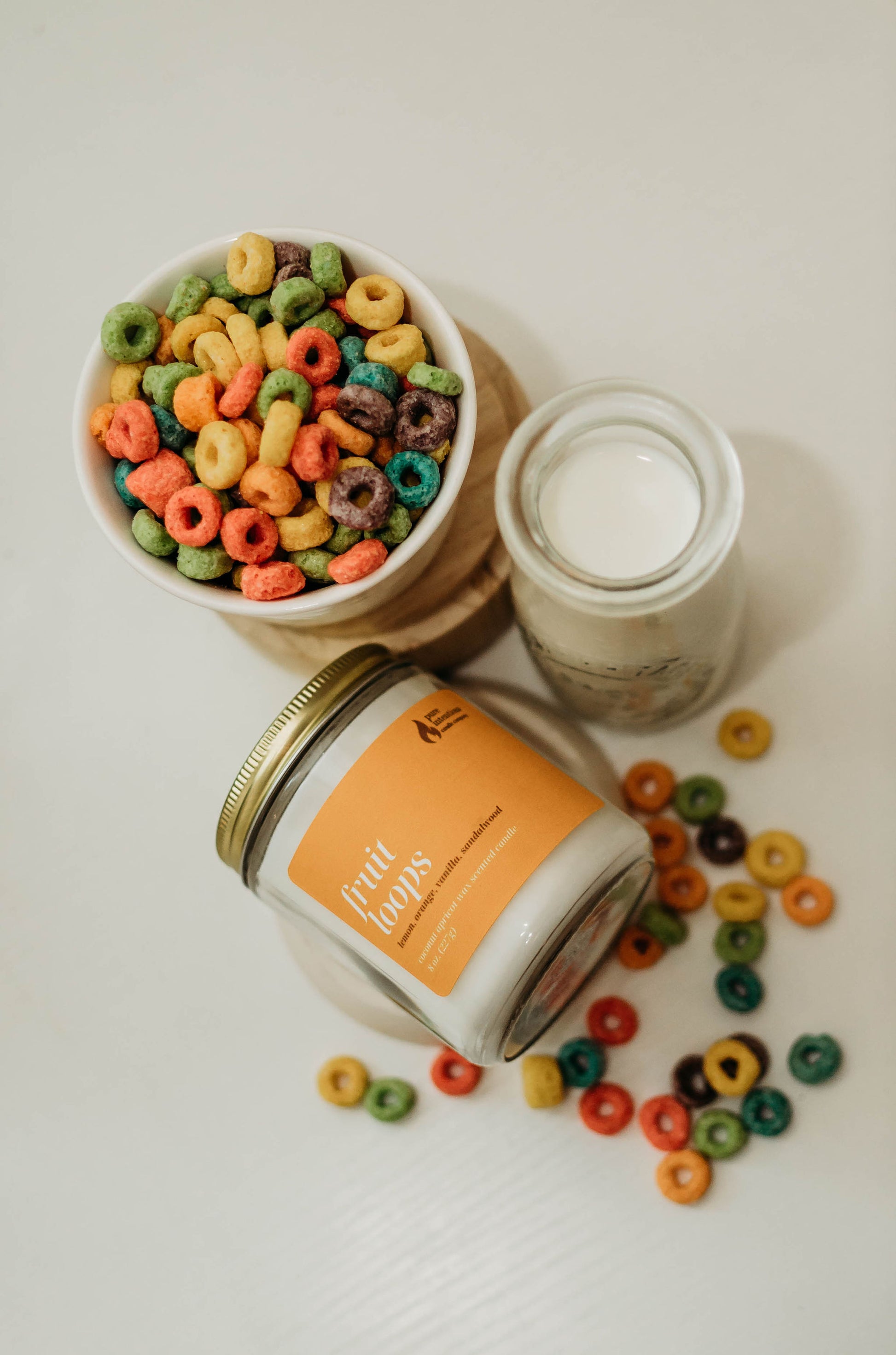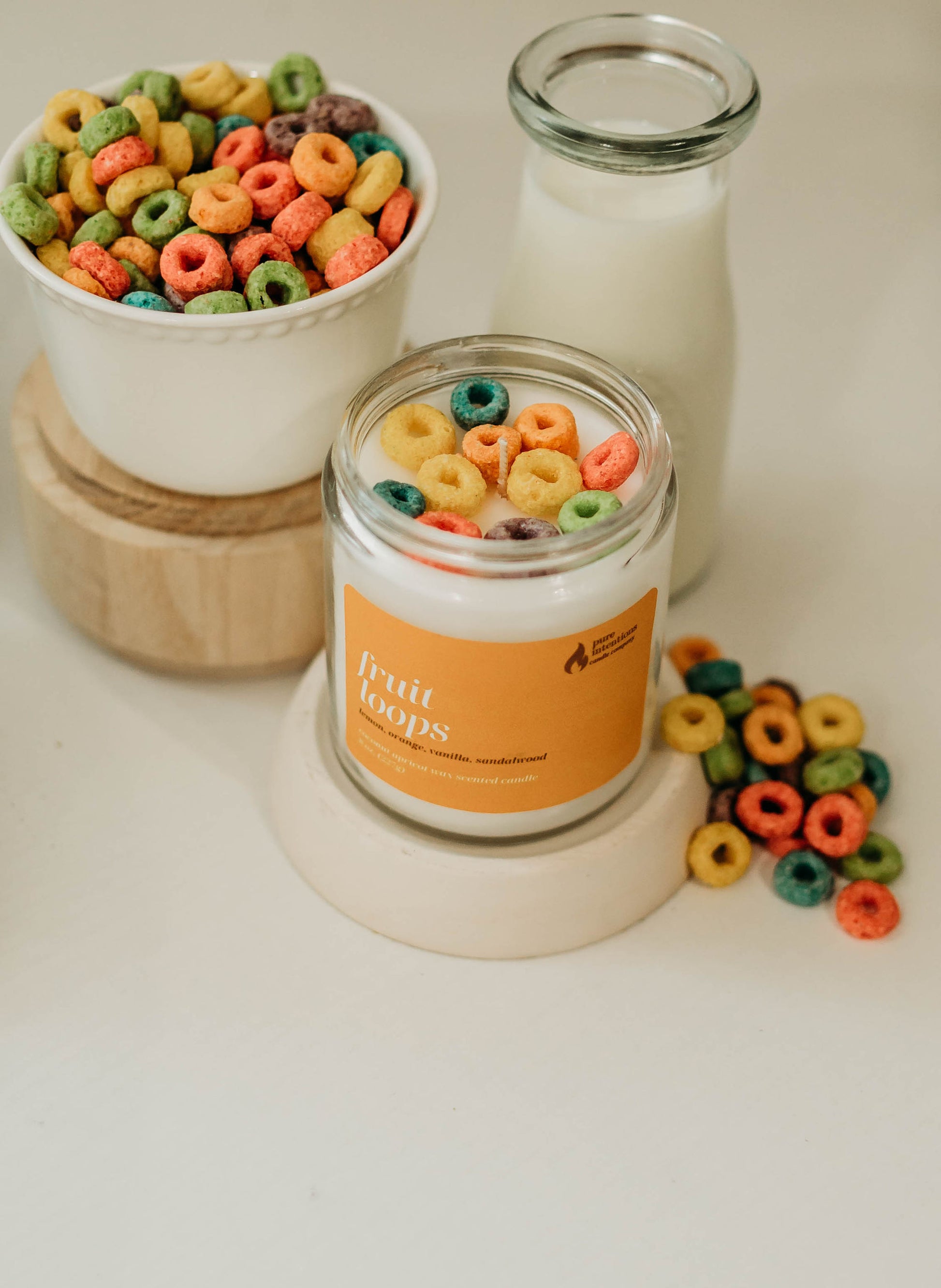 Awaken your senses with the playful and nostalgic scent of our Fruit Loops candle. Bright citrus notes of lemon and orange dance with creamy vanilla and soothing sandalwood, evoking the joy of carefree mornings and childhood delights.
